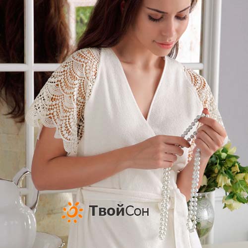 Ванная Комната: махровый женский короткий халат с кружевом St.Tropez white, Tivolyo Турция