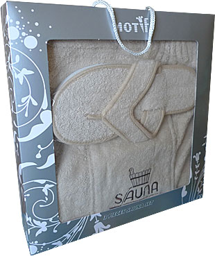 Комплект для сауны упакован в подарочную коробку (сланцы в комплект не входят).