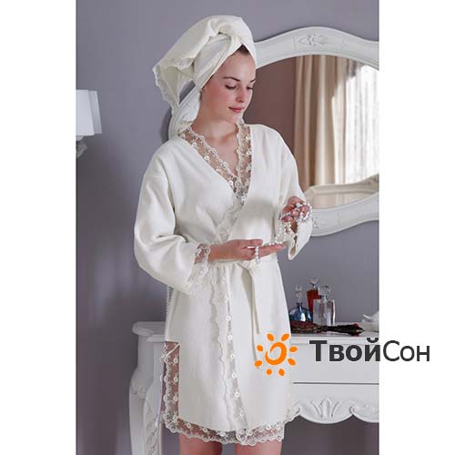Махровый женский короткий халат с кружевом турецкой фирмы Tivolyo Home, Турция - отличный подарок!!! В комплект входит халат и полотенце 50х100 см.